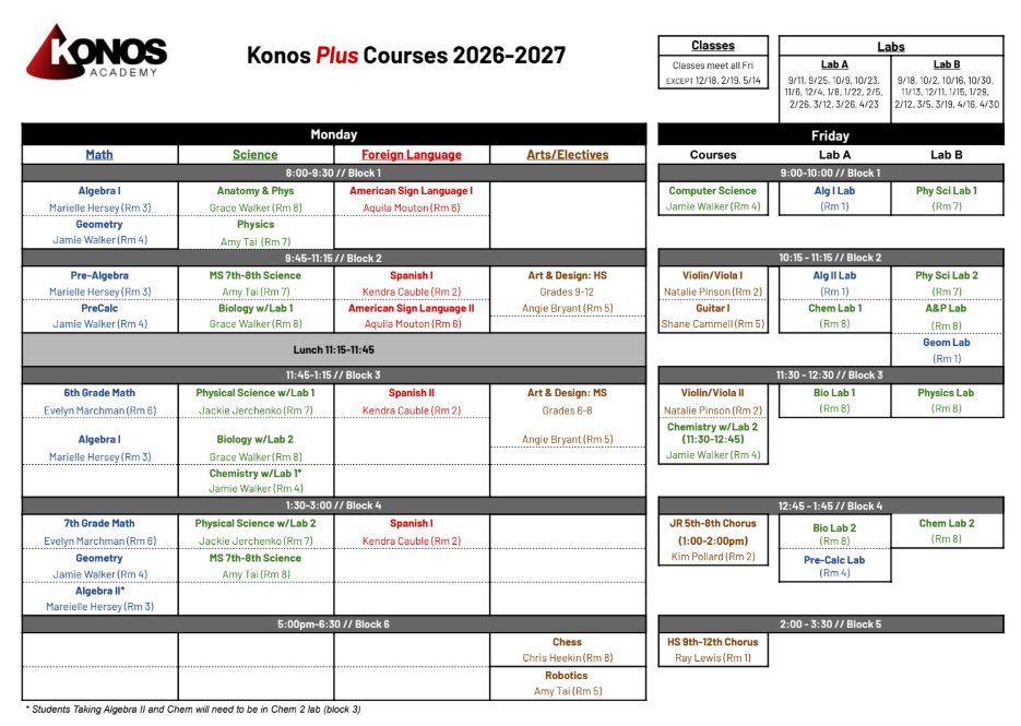Course descriptions are listed below. For specific questions about courses, please contact the course teacher directly. Information below is for the 2025-26 school year. The first monthly cost shown is for Konos Core students; the second is for Konos Plus Only students (e.g. $76/$79).